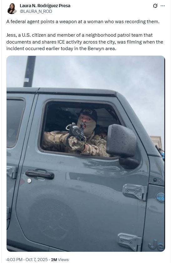 October 7: A masked federal agent is caught on camera aiming a weapon at a resident who is reportedly doing nothing more than documenting his activity. This act is reported by Chicago Tribune reporter Laura N. Rodríguez Presa: