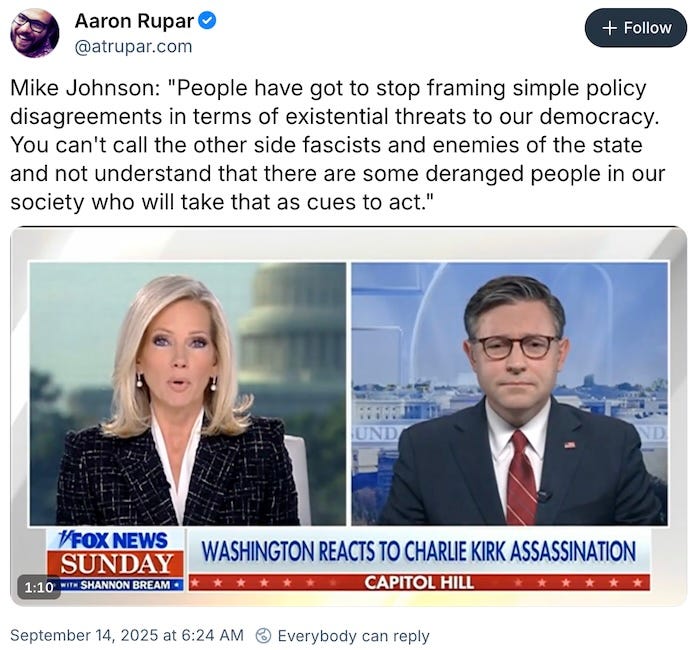 And even when some Republicans dare to note that it’s time to dial down the fear and loathing, they refuse to recognize how much has come from Trump and his cult, trying to both-sides the issue. Look at what House Speaker Mike Johnson said on Fox last Sunday: