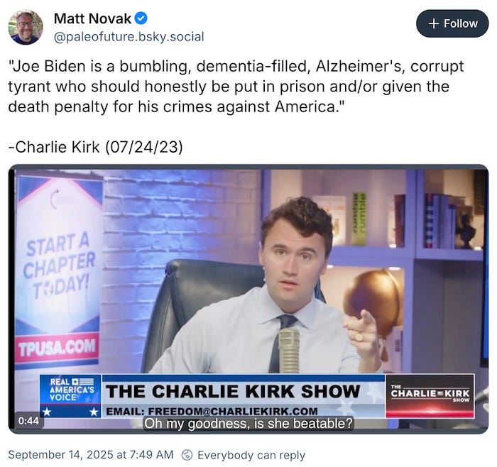 Charlie Kirk, July 24, 2023: “Joe Biden is a bumbling dementia filled Alzheimer's corrupt tyrant who should honestly be put in prison and/or given the death penalty for his crimes against America.”