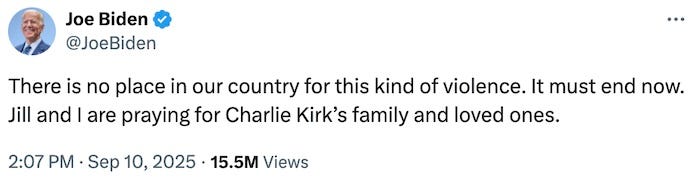 Joe Biden, September 10, 2025: “There is no place in our country for this kind of violence. It must end now. Jill and I are praying for Charlie Kirk’s family and loved ones.”