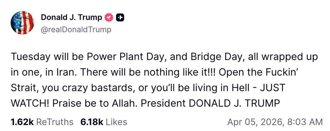 In fairness, Trump made his comment on a weekend that saw the overlap of three major religious observances. Let’s hope that Monday brings greater moral clarity. Trump has said he will destroy all bridges and power plants in Iran by Tuesday evening. There is time on Monday for members of Congress to make clear that such actions will result in his impeachment and removal from office.