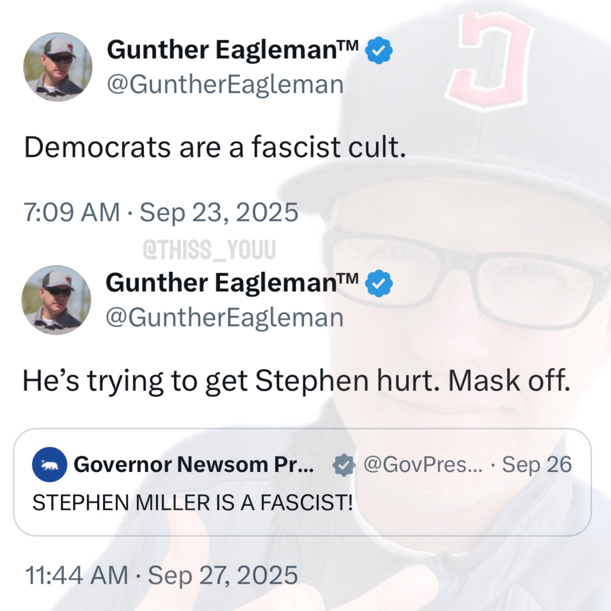Or look at online troll Gunther Eagleman, who thrives on provocation. Eagleman slings insults and promotes authoritarian talking points. But the moment someone uses the word “fascist” to describe Stephen Miller (again, Gov. Newsom yesterday), he pivots to victimhood, claiming the label is an attempt to draw physical violence. Here: