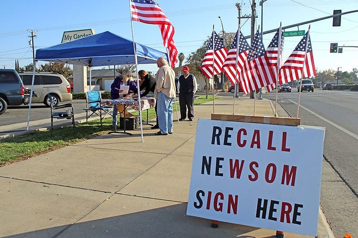 Images: Banana Republican (Daily Kos); Recall Newsom petition booth near Modesto (Ceres Courier); Henry Aaron Roberts.