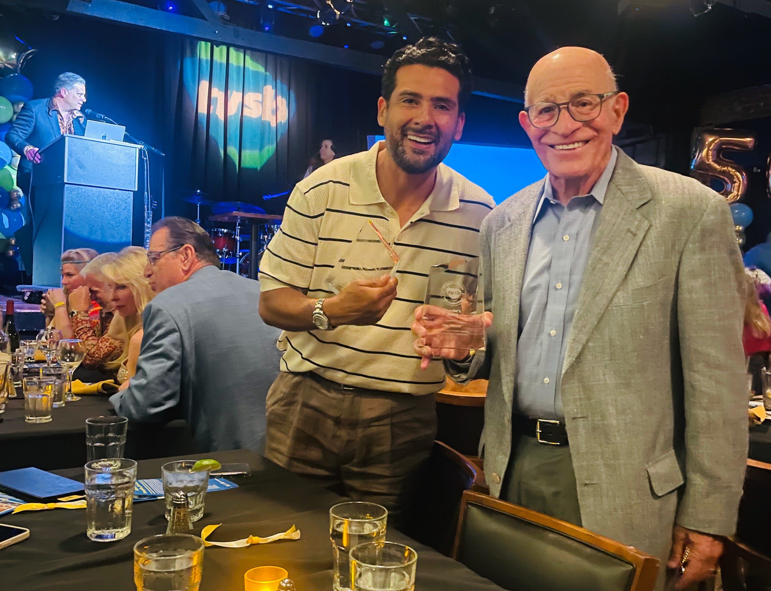 Images: Hap Freund (R) celebrates his honor with Dr. Victor Rios, who was awarded the “Podcast Pioneer Award.” TVSB Executive Director Erik Davis can be seen over his right shoulder, onstage at the gala.