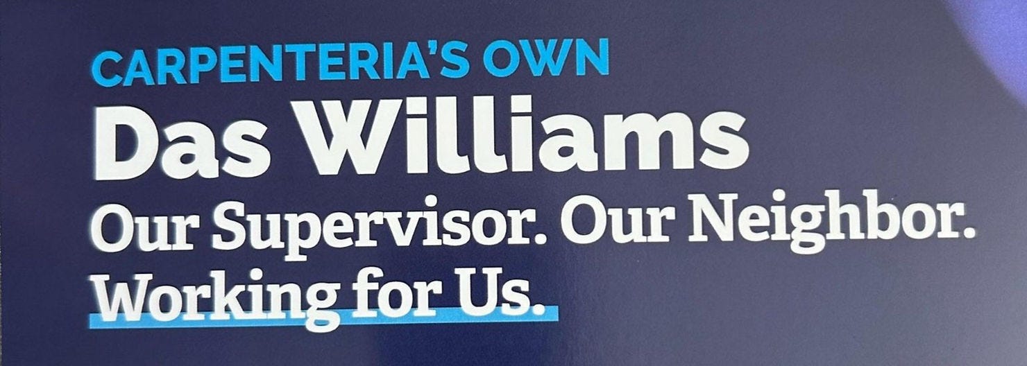 From another angle, however, it's a humiliating unforced error in what should be a no-sweat re-election for Boss Das, not only because opponent Roy Lee is a city council member in (checks notes) Carpinteria -- but also because it validates Lee's critique of Williams as a career politician out of touch with his constituents, a moke with enough campaign cash to hire far-flung professional political consultants who can't manage to spell the name of his own town right, in a mailer targeted precisely at the voters of his own town.