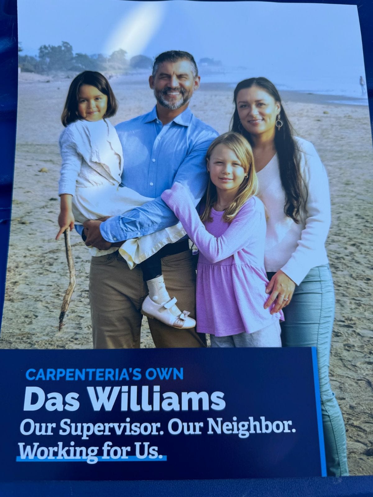 Supervisor Das Williams sent a warm and fuzzy, full-color campaign mailer to his neighbors in Carpinteria this week, portraying himself as a Mr. Dad homeboy.
