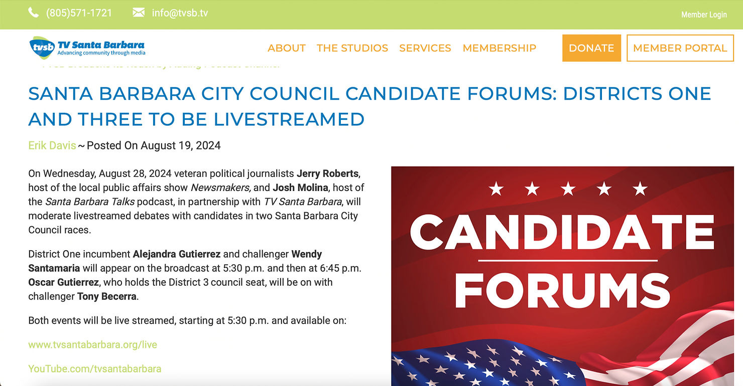 Speaking of which, Josh and the genial host next Wednesday will co-moderate two city council election debates, for Districts 1 and 3, that will be livestreamed by TVSB, in partnership with Newsmakers and the Santa Barbara Talks podcast. We'd love to hear from you via email -- newsmakerswithjr@gmail.com -- about any questions you'd like posed to the candidates.