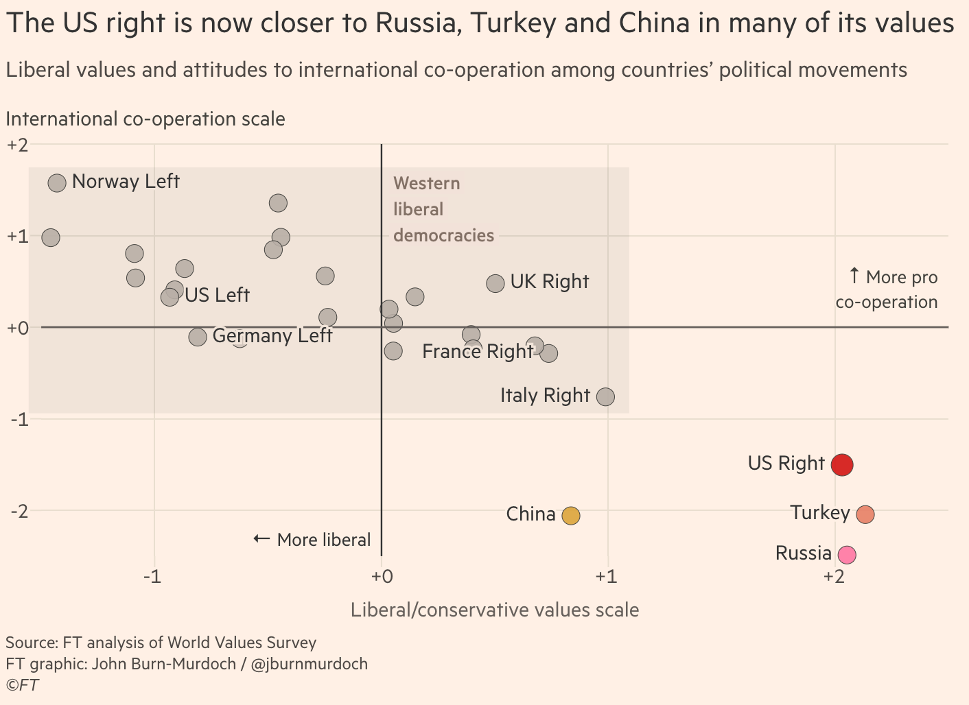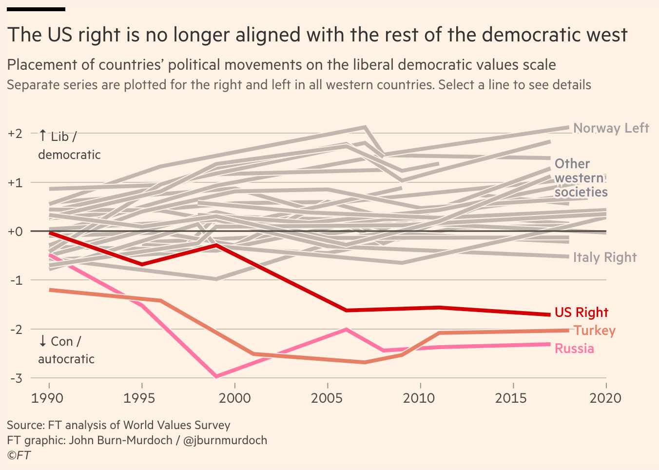 Last week the Financial Times published an extraordinary piece by John Burn-Murdoch.2 He looked at data from the most recent World Values Survey and found that Republican voters in America have changed their outlook in recent years. They no longer want their country to be liberal. They want it to be illiberal.